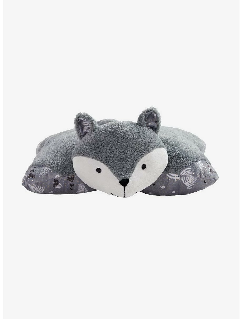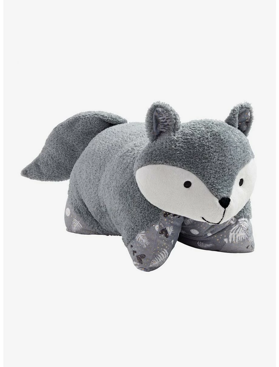 Bring your favorite animal home in the form of a Pillow Pet! This Naturally Comfy Fox features a gray and white fox with a patterned underside with trees, hearts, and gold dots. Pillow Pets presents super soft, cute, and adorable stuffed animals that unfold into fuzzy pillows for sleep. This is a pal during the day, then unfastens to become a pillow by night! Official Pillow Pets product. High-quality fabrics. BPA and Phthalates free. Unfastens into a pillow. To wash, put in white pillow case and tie open end. Cold water. Gentle cycle.