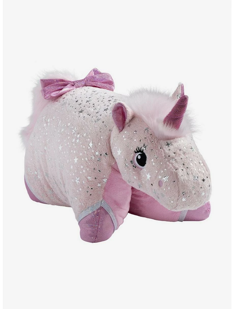 Fans of sparkles and glitter will love our newest pink unicorn! Silver star fabric that sparkles and shines, this Sparkly Unicorn is extra special: she’ll leave a sparkle wherever she goes! Get tons of warm snuggly happiness and cuddle up every day and night with the Pillow Pets Sparkly Unicorn. The plushest, comfiest and softest stuffed animal you will find. Kids of all ages will have fun playing with this special Sparkly Unicorn during the day, and then snuggling with it for reading, watching television, or studying with friends. Ideal for rest time and fun time not to mention a comforting partner on road trips or airplane rides. Starts out as your pal, then unfasten it and use it as a pillow! CARE: Wash on gentle cycle and cold water placing your Pillow Pet inside a white pillow case and tying off the open ends to prevent damage during washing and to maintain plush. Do not put in the dryer. SPECIFICS: Official Pillow Pets product. Made of high-quality washable plush fabrics. BPA-free and Phthalates-free materials. Opens to an 16inch flat stuffed pillow. All sizes are approximate. Ages 0+.