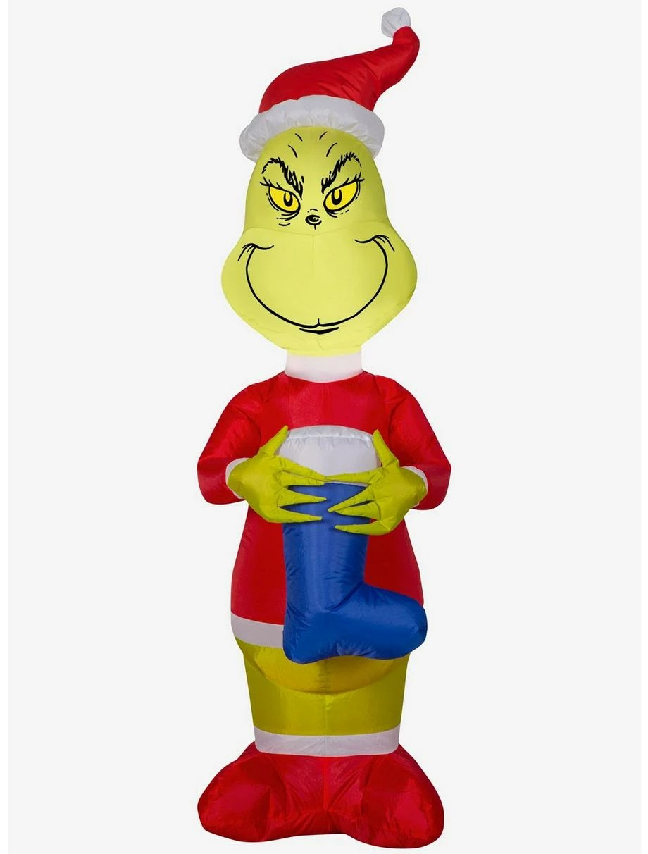 Grow your heart three sizes with this Airblown Inflatable featuring the one and only Grinch dressed as Santa! Decked out for the season with a blue stocking, this crafty character is ready to celebrate the season. Setup is super simple. Just plug it in, stake it down and watch the magic unfold. Display this whimsical holiday decoration as a standalone or combine it with other Airblown characters to create a custom scene. Includes everything needed for easy outdoor setup.